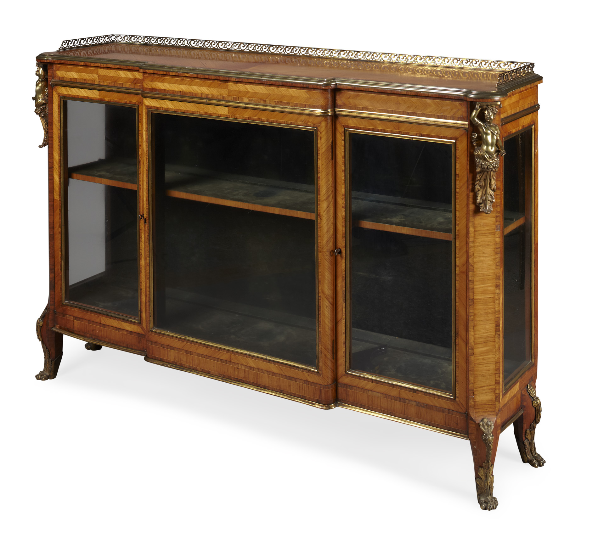 the shaped quarter veneered and brass bound rectangular top with a three quarter pierced gallery over a central glazed door flanked by two further glazed doors opening to shelves and glazed panels to the sides, the canted angles mounted with gilt metal caryatids, raised on gilt metal hairy paw feet