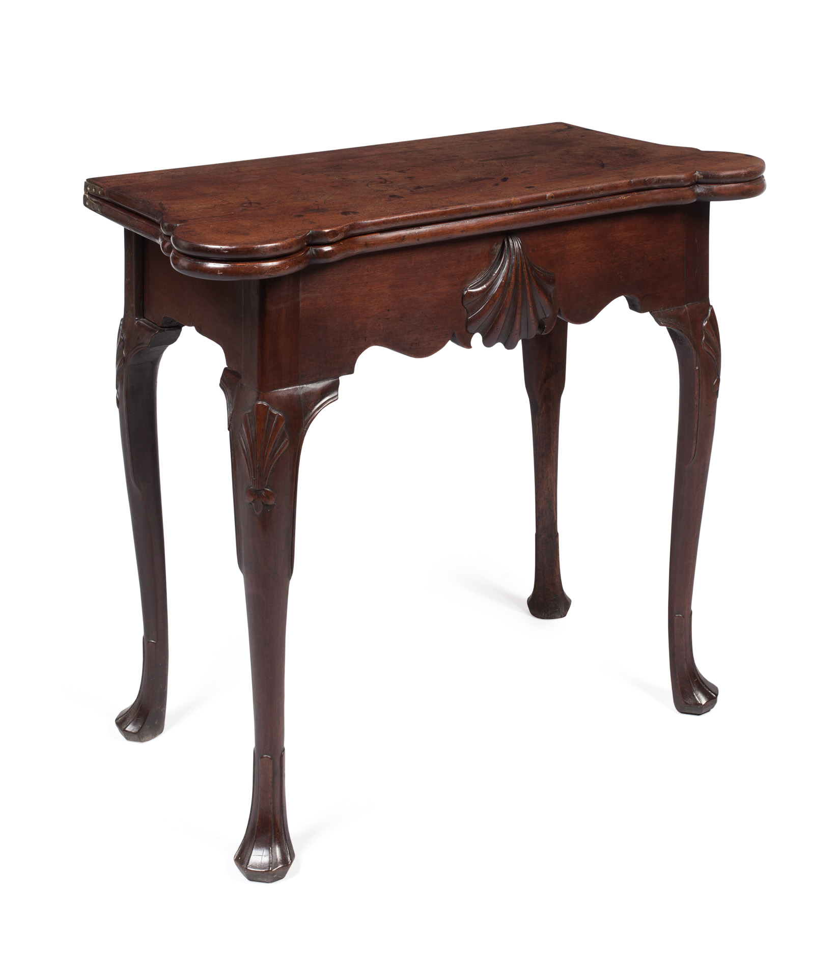 the foldover top with rounded outset corners above a serpentine frieze centred by a carved shell, raised on cabriole legs carved at the knees with shells and ending in fluted pad feet