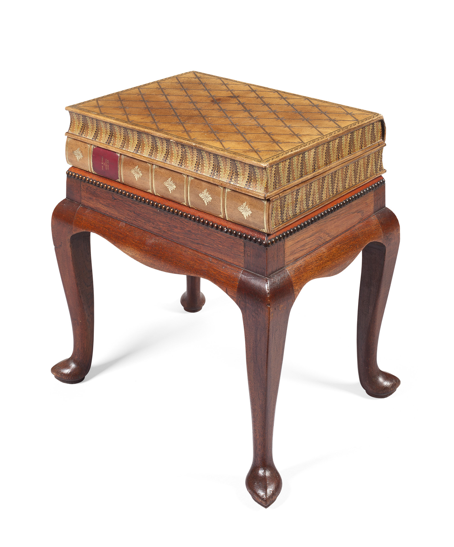 the hinged top section in the form of two leather bound books opening to a void interior, raised on cabriole legs ending in pointed pad feet