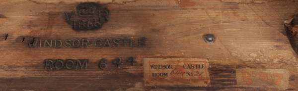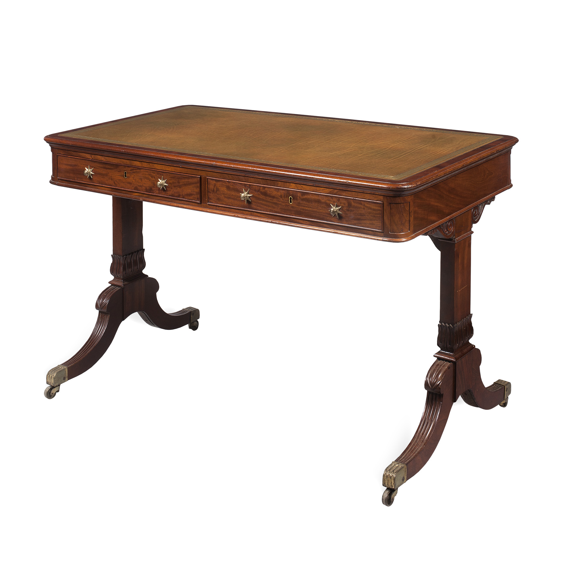 the rounded rectangular top with a green tooled leather insert, above two short frieze drawers with brass star escutcheons, with two dummy drawers opposing, raised on squared lotus carved side supports on reeded sabre legs ending in brass caps and castors; stamped on the underside 'Windsor Castle / Room 6411' under a crowned VR, with a paper inventory label with item no. 20