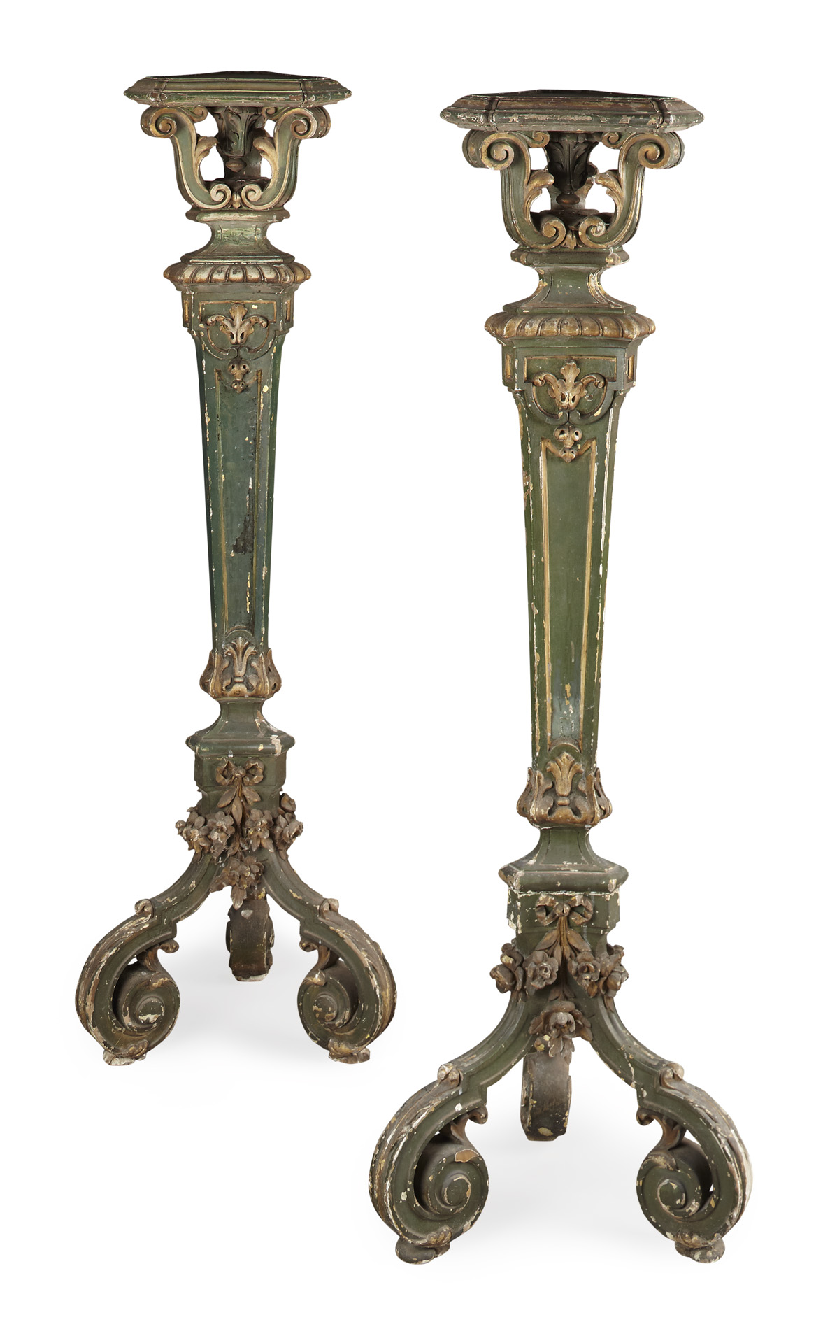 PAIR OF REGENCY GREEN PAINTED AND PARCEL GILT TORCHERE STANDS