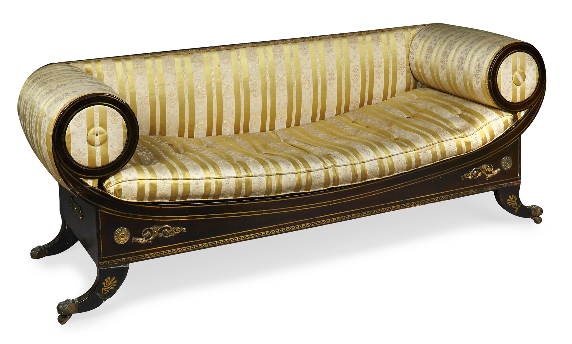 REGENCY EBONISED AND BRASS INLAY SETTEE