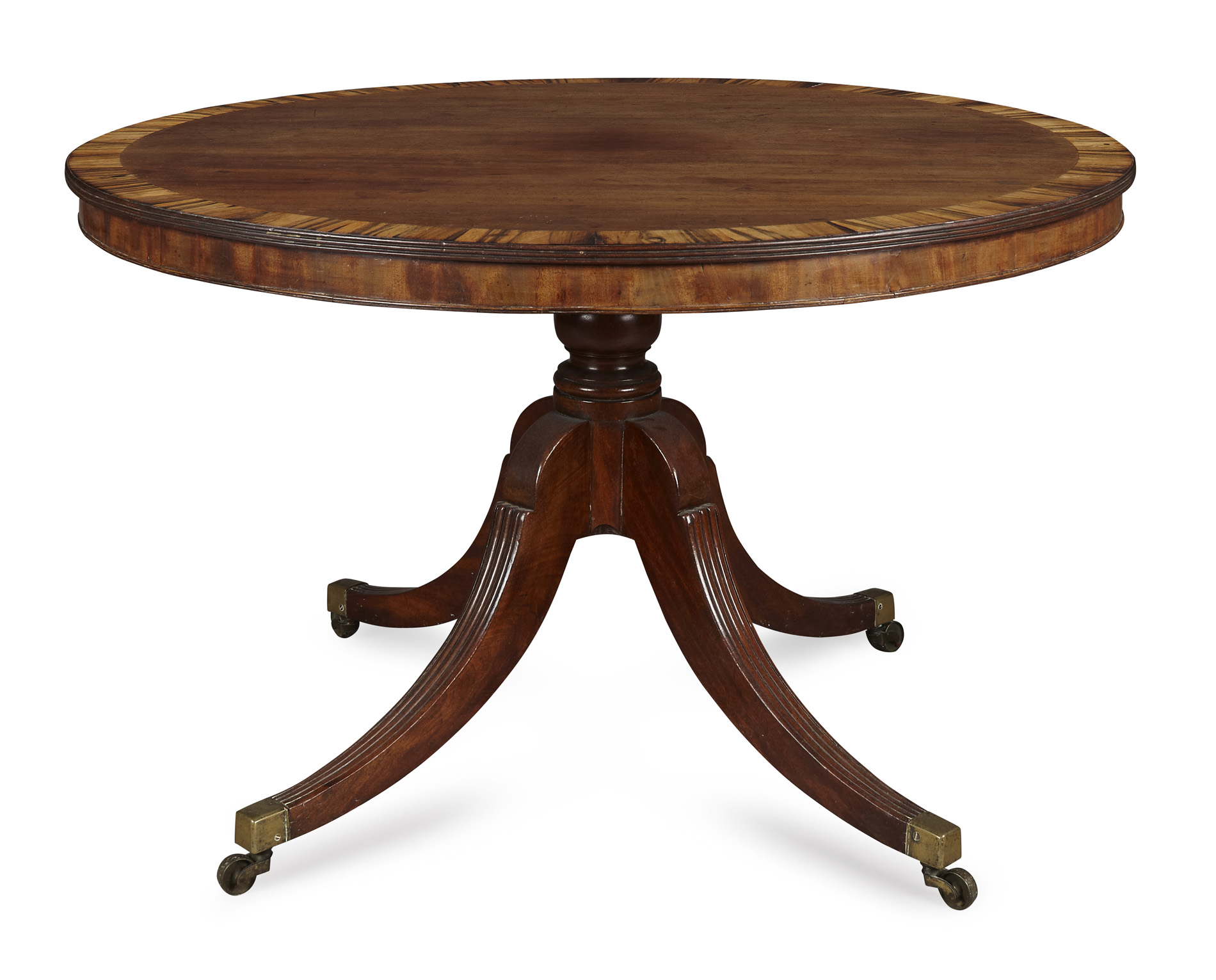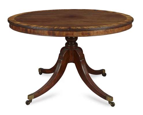 REGENCY MAHOGANY AND CALAMANDER CROSSBANDED BREAKFAST TABLE