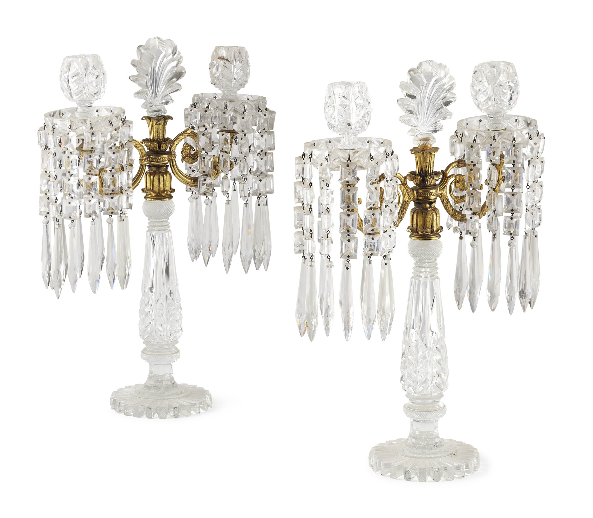 PAIR OF REGENCY CUT GLASS AND GILT BRONZE CANDELABRA