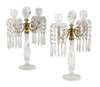 the central cut glass baluster stem issuing two gilt bronze scrolling candle arms mounted with cut glass candle holders, drip pans and hung with prism lustres, with a cut glass shell motif finial and serated circular foot (2)