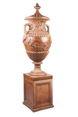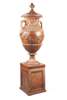 LARGE TERRACOTTA COVERED URN AND PEDESTAL