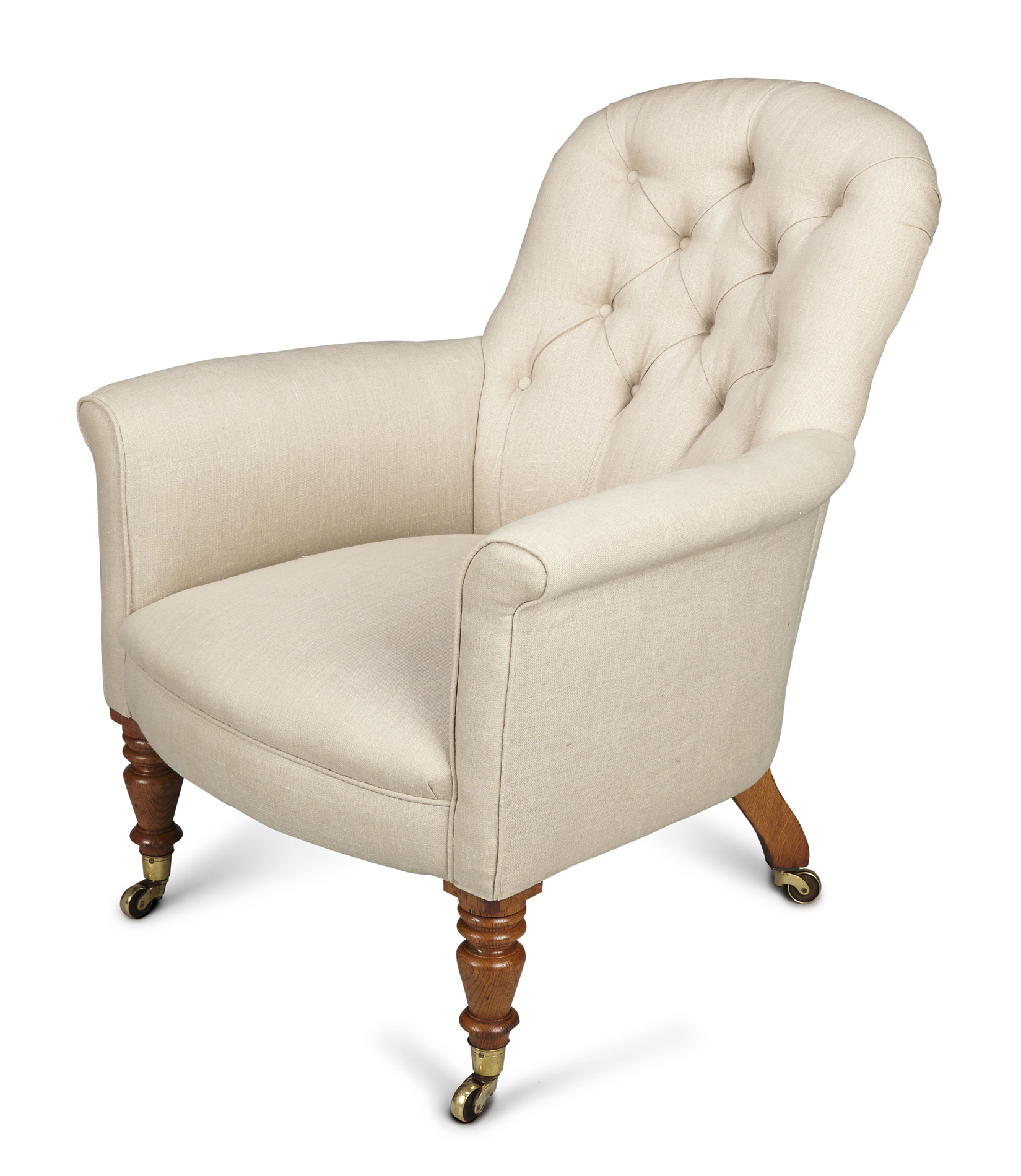 the arched button upholstered back over a pair of straight scroll arms and seat, raised on turned oak legs ending in brass caps and castors, in natural linen upholstery