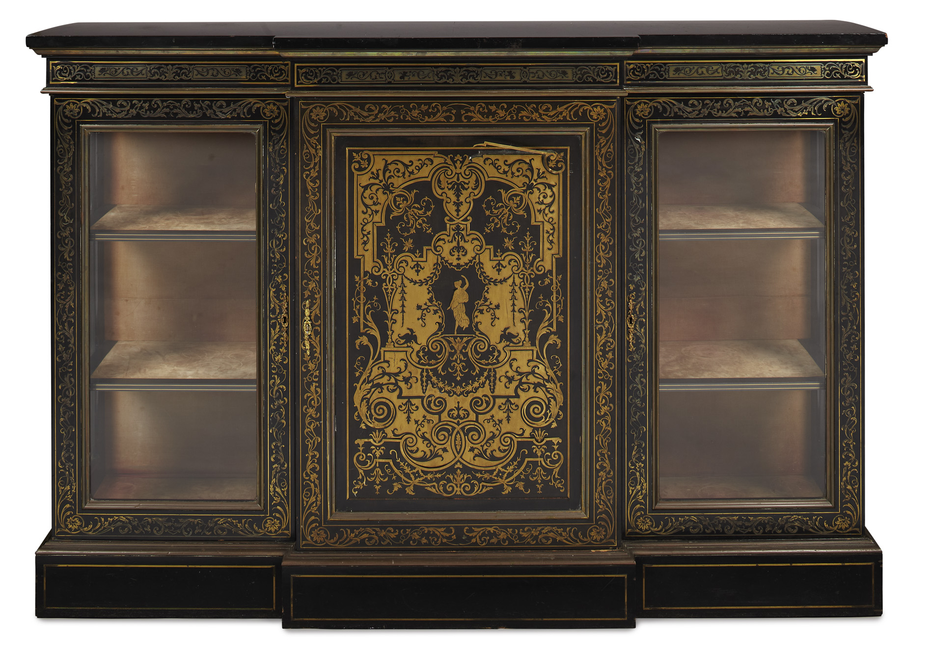 VICTORIAN EBONISED BOULLE MARQUETRY BREAKFRONT SIDE CABINET