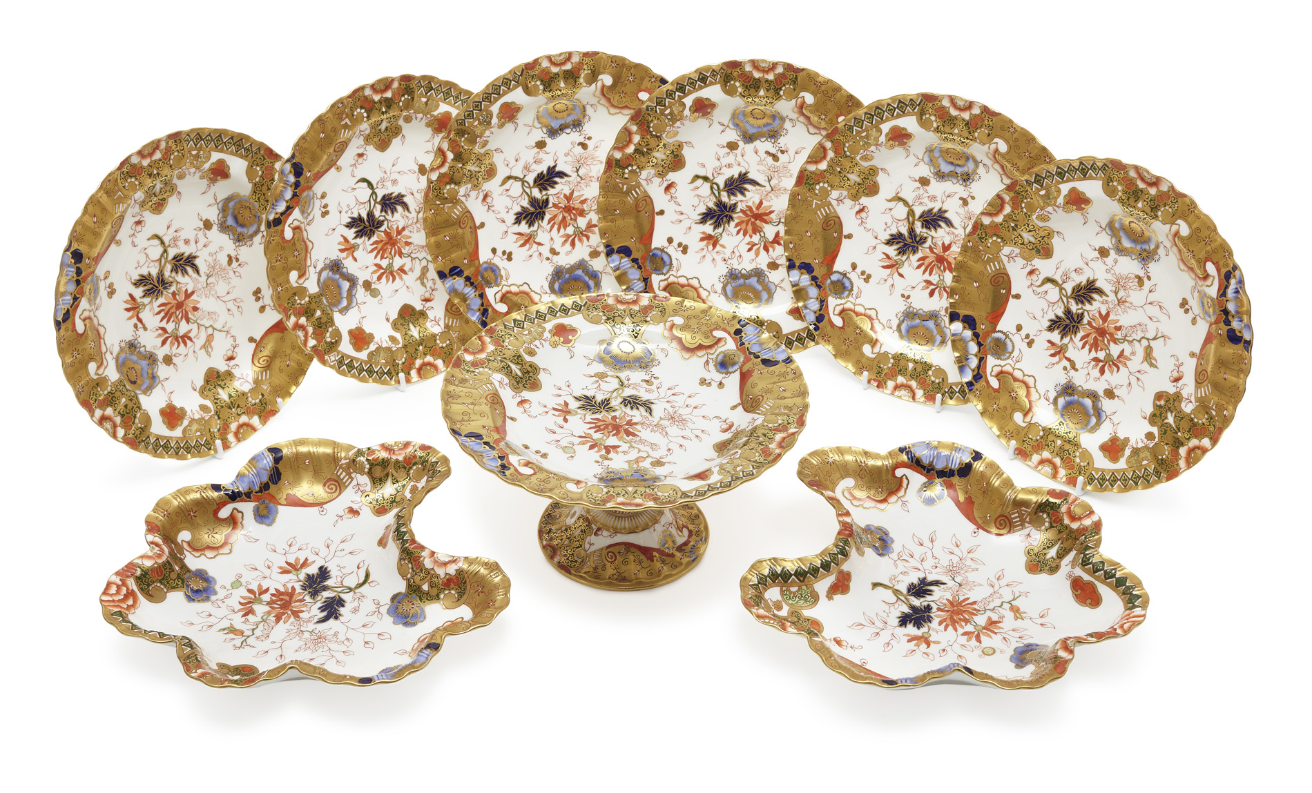 comprising a tazza, a pair of shaped dishes, and six side plates, decorated with flowers in a gilt enriched border, green and red printed marks (9)