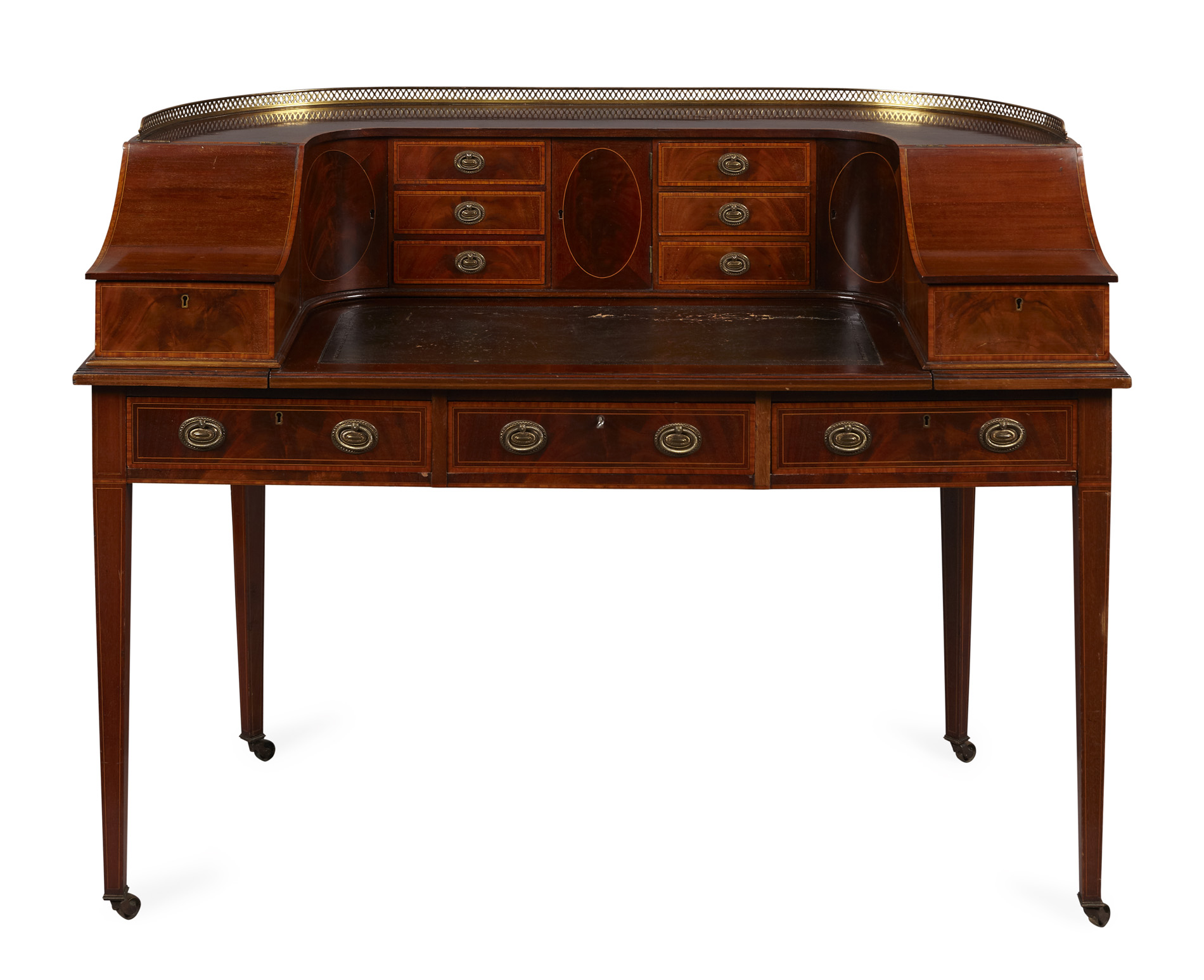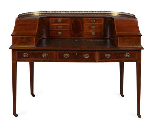 of typical form with a pierced brass gallery and brown leather sliding writing surface, bearing an ivorine maker's label to the central frieze drawer, raised on squared tapered legs ending in brass caps and castors