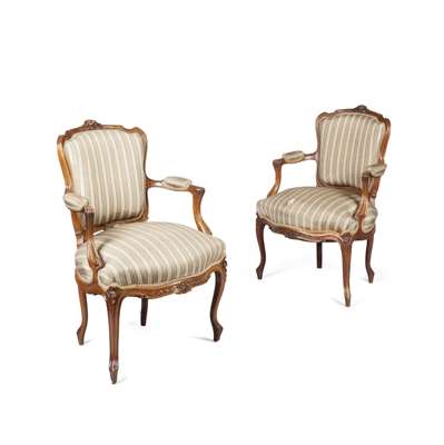 PAIR OF LOUIS XV STYLE CARVED WALNUT FAUTEUILS