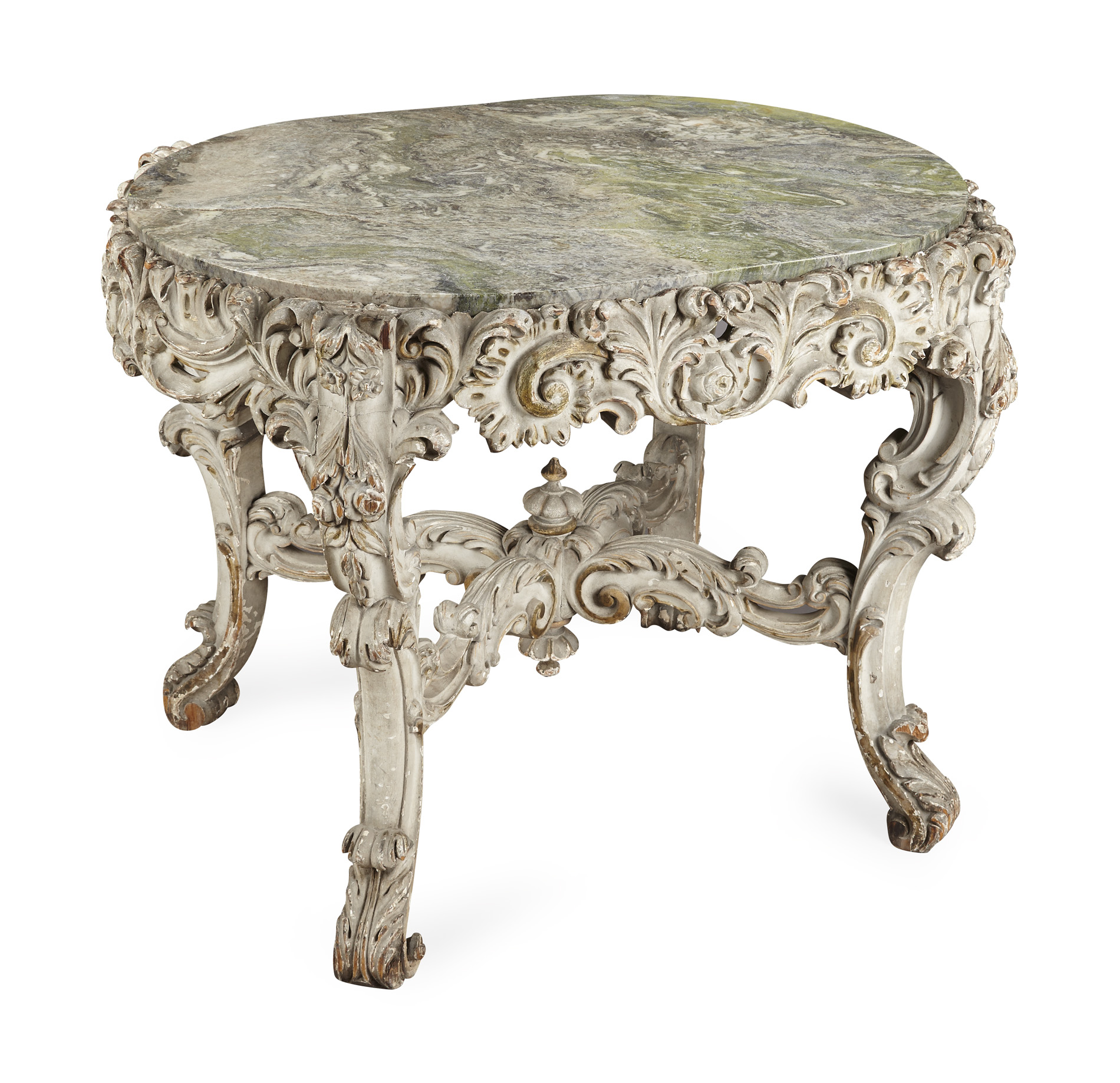 the oval green veined insert marble top over a pierced frieze boldly carved with acanthus and shell motifs, raised on similarly carved double C-scroll legs joined by acanthus carved scrolling stretchers united by an urn finial