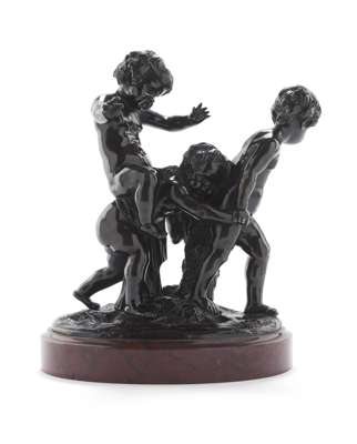 bronze, dark brown patina, modelled as three bacchic children with a garland of grapevines on an oval rouge marble base