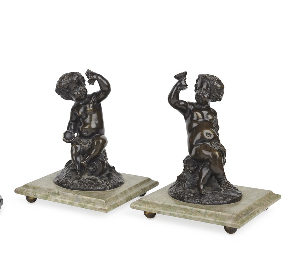 dark brown patina, modelled as a pair of bacchic children seated on naturalistic bases, signed 'Clodion', on a pale green square marble base (2)
