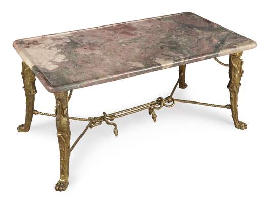 the dished rectangular breche marble top raised on gilt metal legs cast with swans and ending on hairy paw feet united by a gilt metal knotted rope motif stretcher