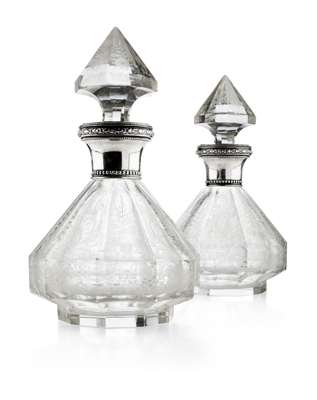 the pointed faceted stoppers in an embossed silver collar stamped 800 above a faceted body etched with flower and foliage motifs, on a conforming foot (2)