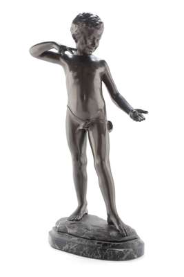 bronze, greenish brown patina, modelled as a draped boy holding a snail in his left hand, on a naturalistic base signed 'Th. Somme' and stamped 'Etling Paris' on a shaped oval green marble base