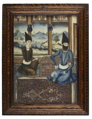 gouache on paper, depicting a scribe and a scholar kneeling on rugs in an interior by a window, a landscape view in the distance, framed