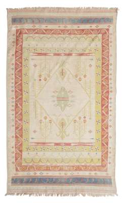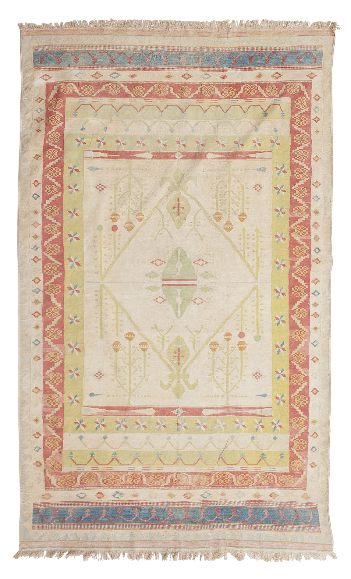 Chaldecott notes on p103 that this is one of two: "highly stylised and very finely woven dhurries with a rather more unusual treatment of the central medallion ... the naive quality of the design and the mirror-image compostition are a mark of their originality. The use of several borders, additional top and bottom stripes, known as patti, and the fineness of the weaving indicate a special comission rather than a standard jail product."