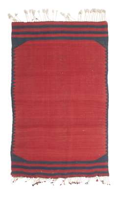 the plain red field within indigo zig zag side bands, red and indigo striped ends