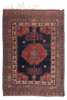 the indigo field with red medallion suspending floral vase pendants, red spandrels, within ivory, yellow and brown triple borders