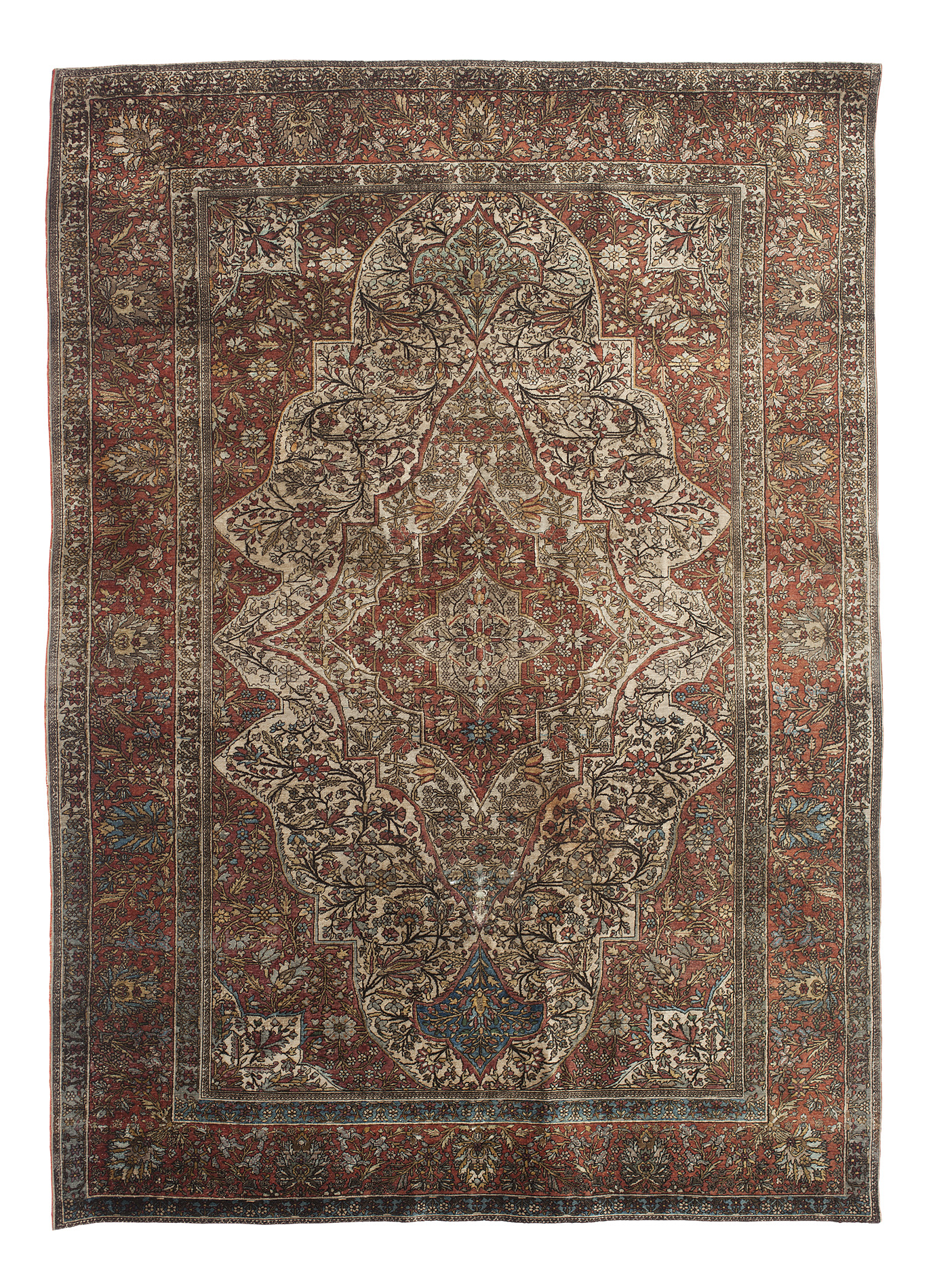 the ivory field with red and ivory medallion suspending pendants, similar spandrels, within red palmette and vine border between bands
