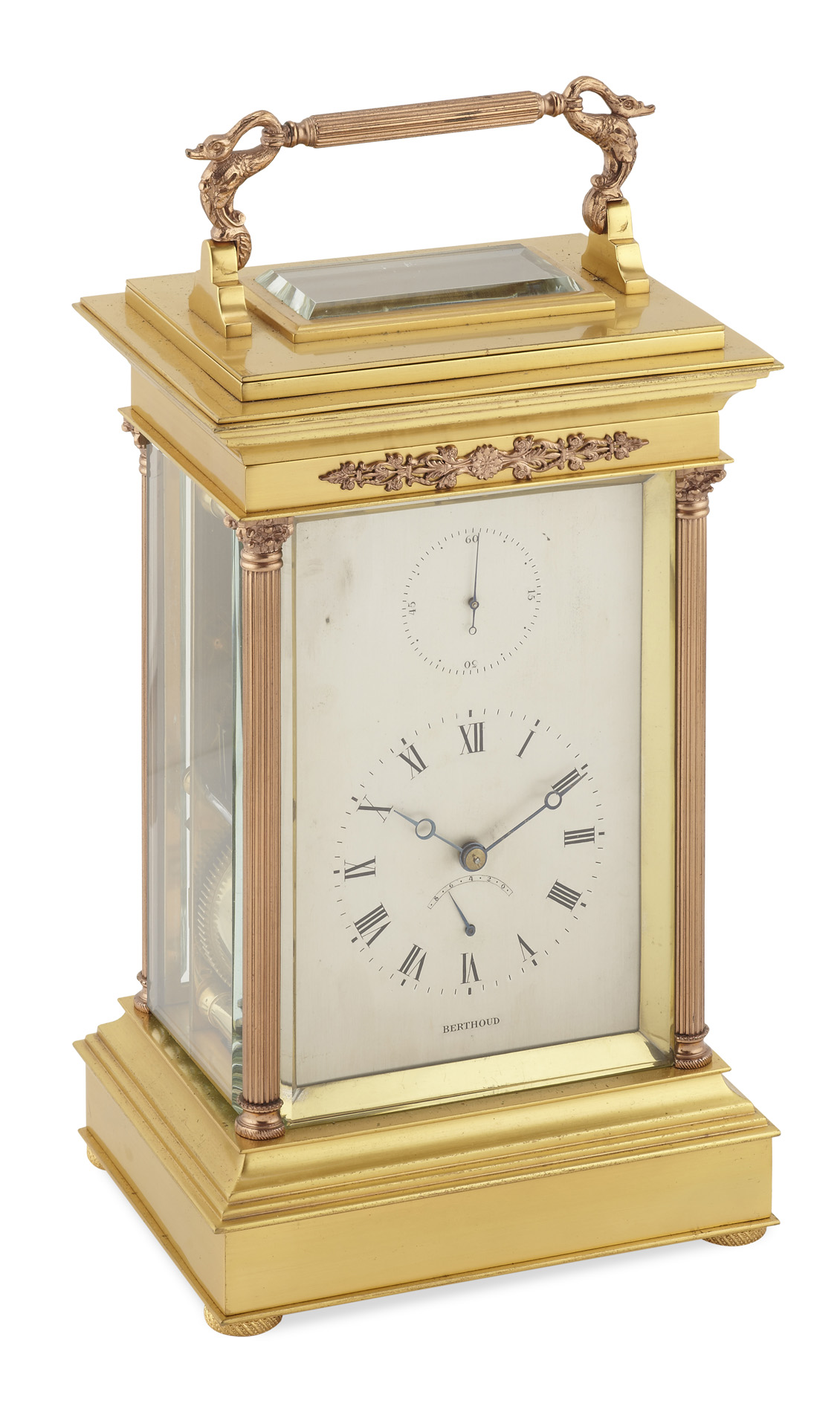 the reeded handle with swan neck supports above a bevelled glass panel and projecting moulded cornice and frieze with foliate mounts, over a silvered dial with Roman chapter enclosing an up/down quadrant above the VI and subsidiary seconds dial above the XII, signed BERTHOUD, the dial flanked by reeded Corinthian columns, eight day movement with spring detent platform, with remontoir, hour striking on a gong