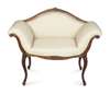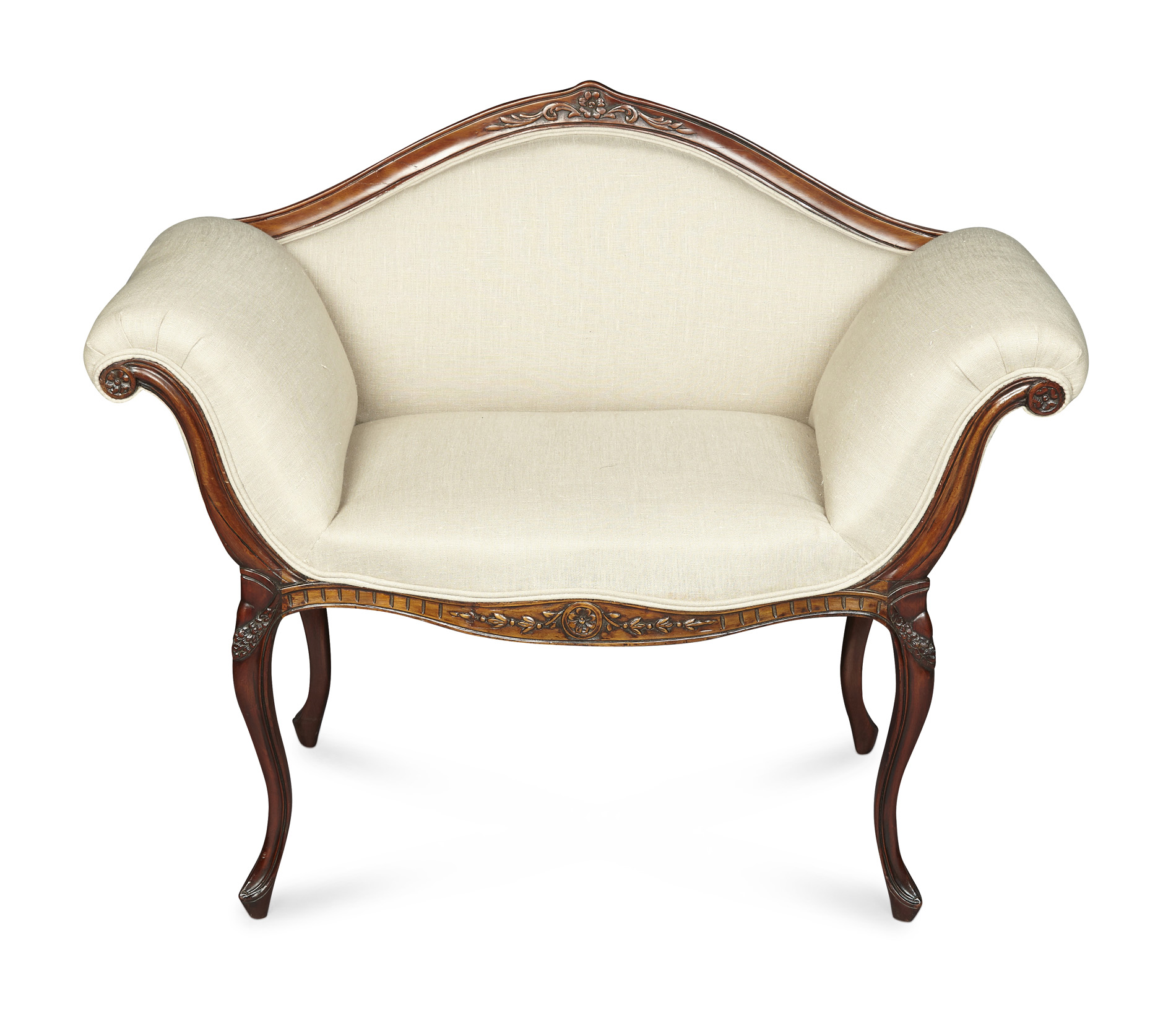 the arched padded back over padded scroll arms and seat in natural linen upholstery, raised on cabriole legs, the frame carved with foliate scrolls and bell flowers