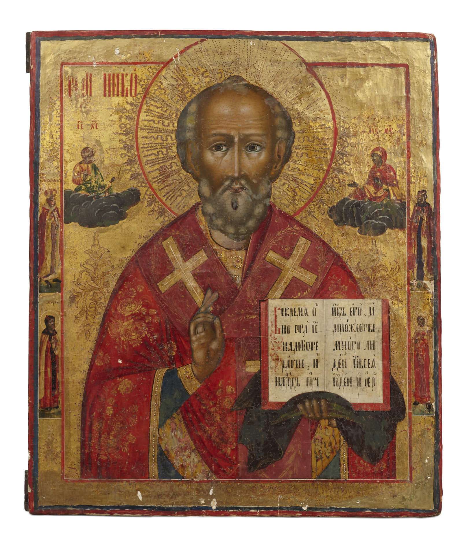 the saint depicted with his hand raised in blessing, Christ and the Mother of God seated on clouds above his shoulders, the margins with four additional saints, against a gilt ground with red border