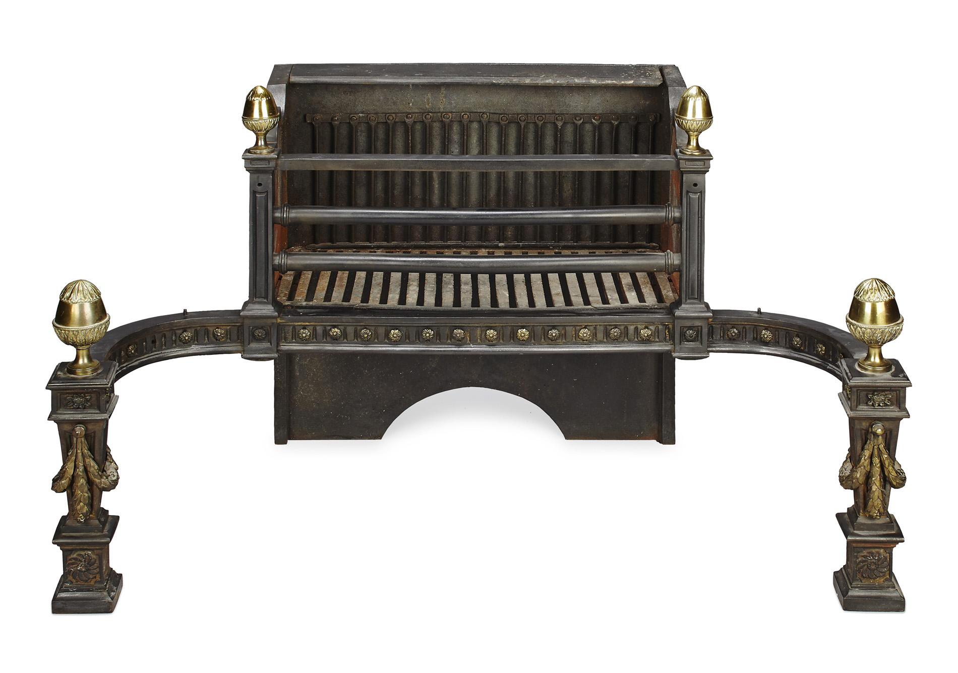 the fire basket with an iron bar front and two curved arms with brass acorn finials and hung with brass laurel garlands
