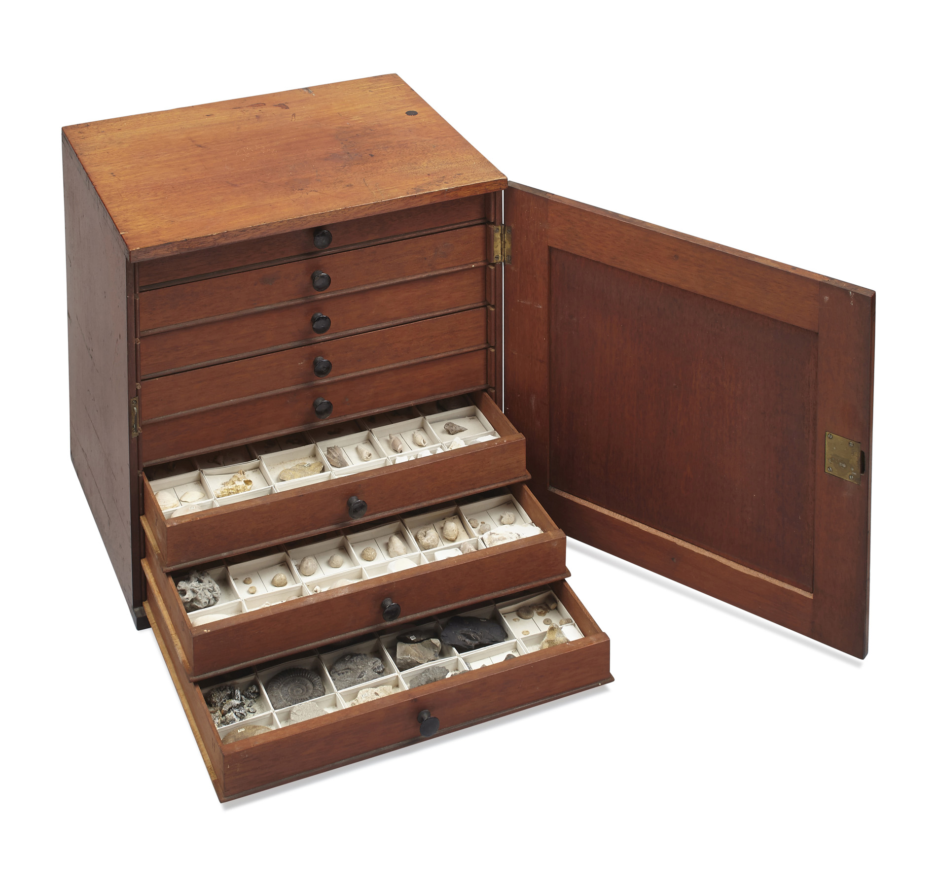 of cubic form, the door opening to eight shallow drawers compartmentalised and containing a numbered collection of minerals, rocks, and fossils together with Tennant's hand written pamphlet dated 1851, identifying each specimen by name and location of origin