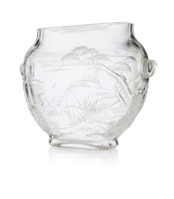 the flattened globular form with lug handles, wheel cut with a crane, pine tree and bamboo