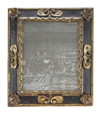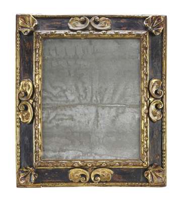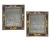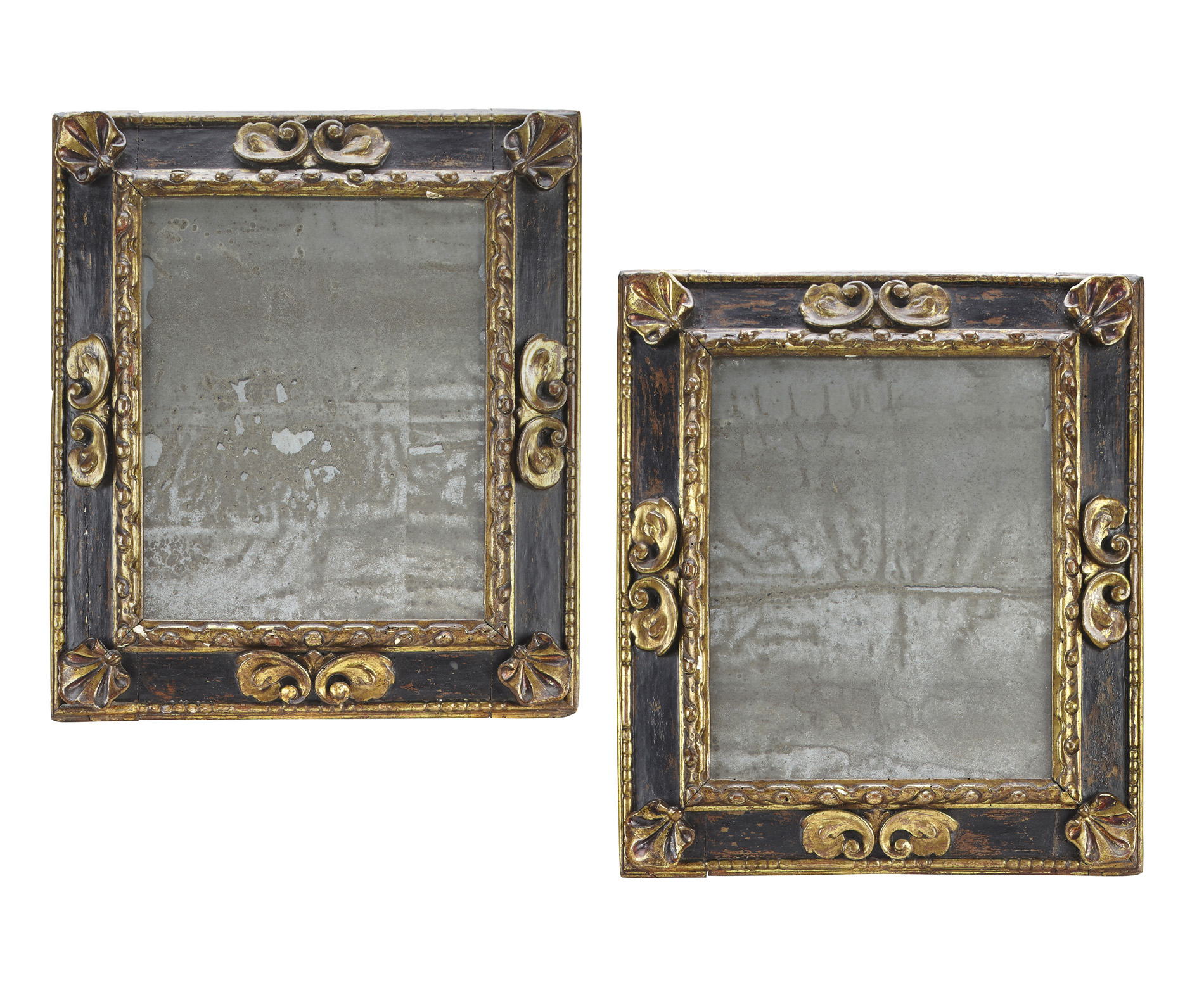 the rectangular mirror plates in a gadrooned and scroll carved and black painted frame marked at the corners with shells, with gilt details (2)