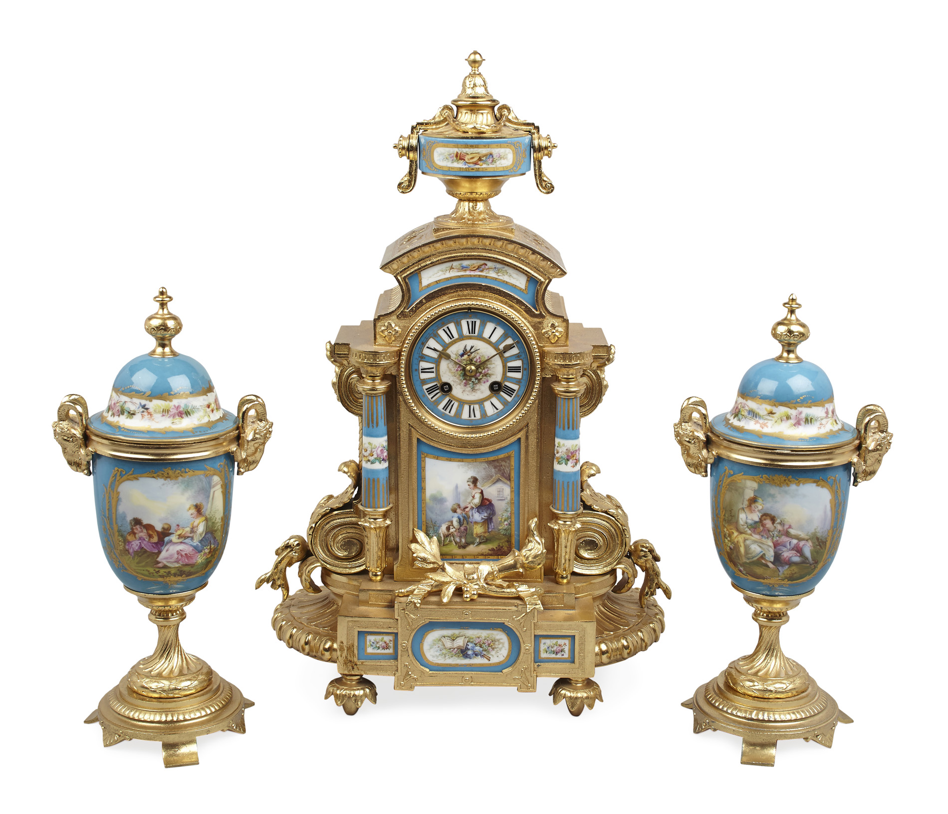 FRENCH PORCELAIN AND GILT METAL THREE PIECE CLOCK GARNITURE