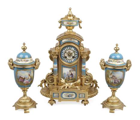 in the Louis XVI style, the painted porcelain dial with Roman numerals, the centre painted with a bird amongst flowers, above a further porcelain panel depicting a mother and child flanked by porcelain columns with a bleu celeste ground, the arched case stamped BRUNFAUT and surmounted by an urn finial; the eight day movement stamped P.R. 7267 and striking on a bell; together with a pair of covered urns decorated with floral reserves against a bleu celeste ground, with gilt ram's head handles raised on a socle base (3)