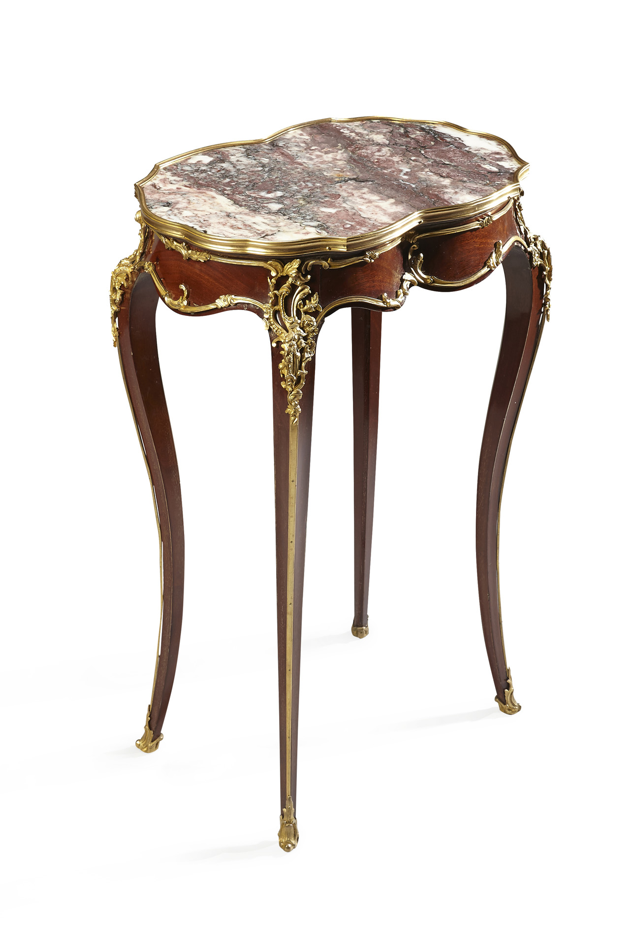 FRENCH LOUIS XVI STYLE AMARANTH, GILT BRONZE AND MARBLE TABLE IN THE MANNER OF FRANCOIS LINKE