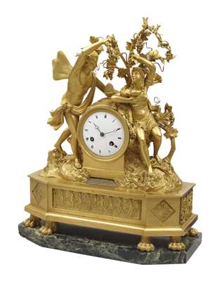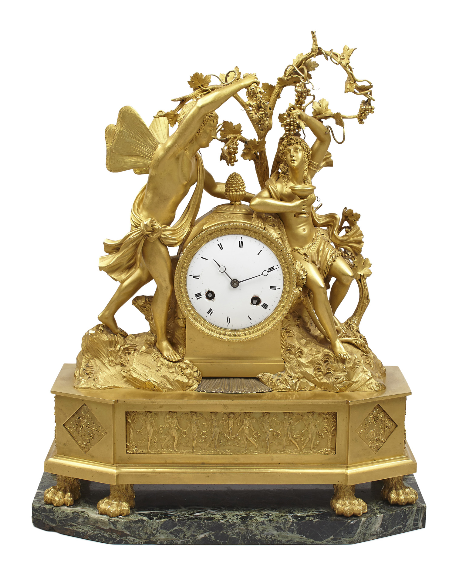depicting Erigone seated on a lion's pelt beneath a fruiting grape vine and holding a chalice and a bunch of grapes, being presented a floral crown by the draped figure of Zephyr, on a naturalistic rocky ground; the circular white enamel Roman number dial in a barrel case surmounted by a pine cone finial and inscribed 'Zephir precede Bachus au coeur d'Erigone et de plaisir ses sens ... elle dit ah Zephir me Couronne', on a plinth base with classical relief panels, raised on hairy paw feet on a shaped verde antico marble base, the eight day movement striking a bell