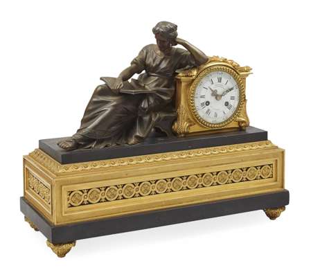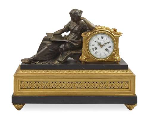 the allegorical figure of a seated woman with an open book on her lap leaning against the gilt bronze clock case, the white enamel dial with Roman and Arabic number chapters and signed 'DENIERE/ Fr DE BRONZES/ A PARIS, with two winding holes, raised on a rectangular plinth base cast with Vitruvian scrolls and rosettes, on acanthus cast feet, the movement stamped 1178 DENIERE A PARIS and CAILLEAUX