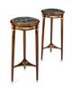 the circular green marble insert tops above a plain frieze with gilt metal mounts, raised on fluted columns joined by a triform stretcher raised on toupie feet (2)