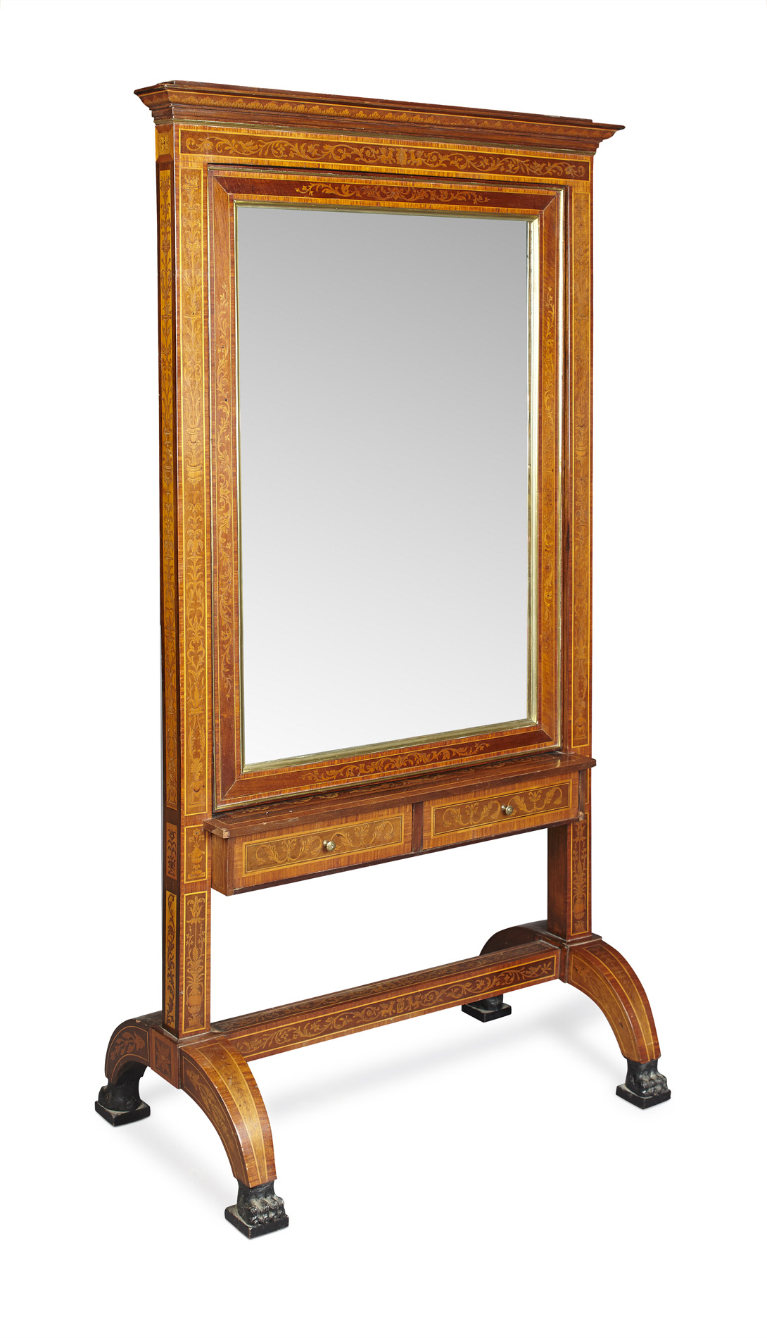 CONTINENTAL MAHOGANY, KINGWOOD CROSSBANDED AND MARQUETRY CHEVAL MIRROR