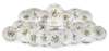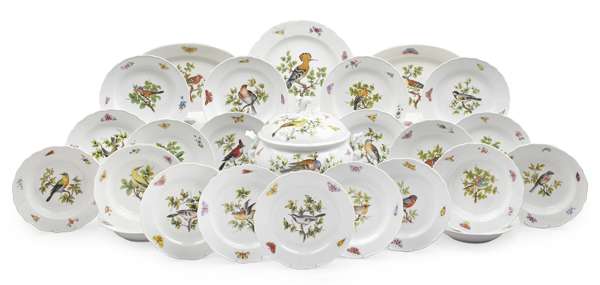 each piece decorated with a songbird with insects, flower sprigs and butterflies to the border, comprising a circular tureen and cover with scroll handles; two oval platters, a large circular serving dish, twelve dinner plates; seven fish plates; and six dessert bowls (qty)