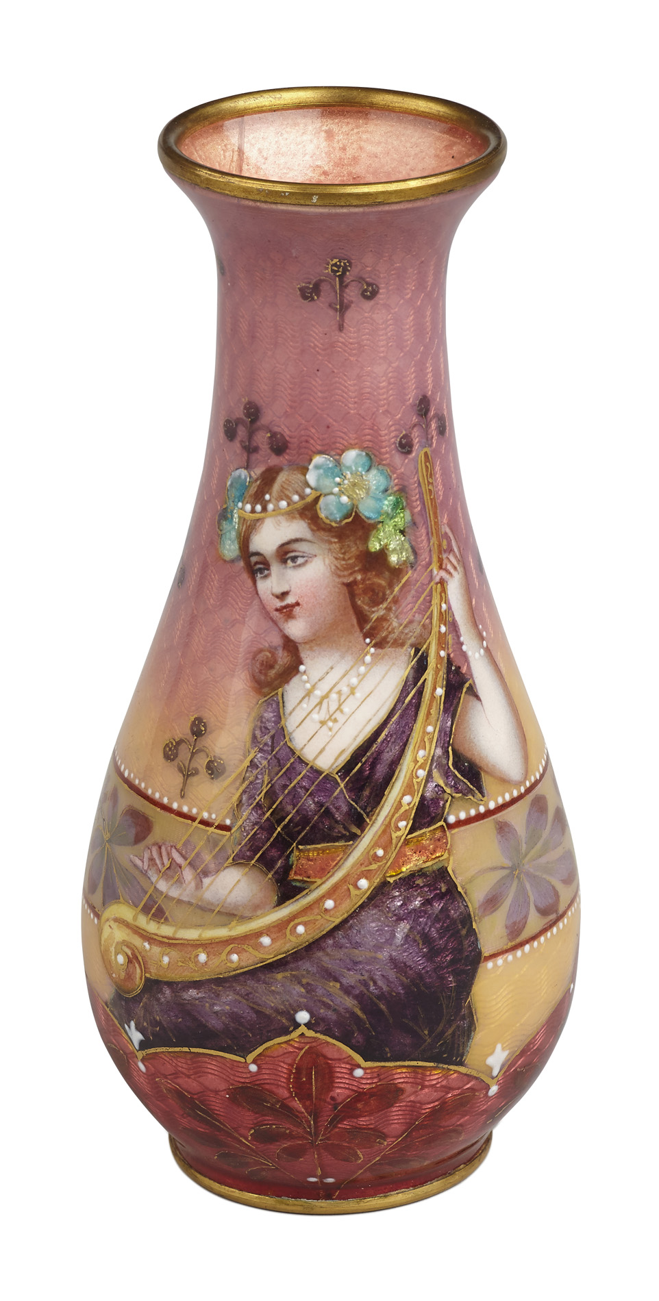 of bottle form, decorated with a young beauty playing a harp against a mauve and pink ground, with gilt details and raised 'jewels'