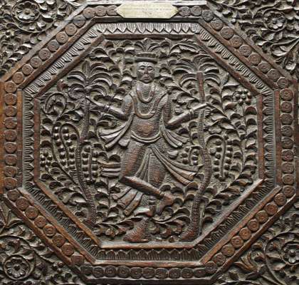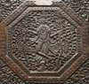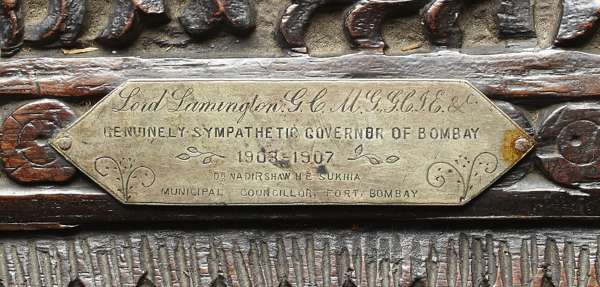 the octagonal top with a central relief carved figural reserve, in a foliate carved border, bearing a silver plaque inscribed 'Lord Lamington GCMG GCIE/ GENUINELY SYMPATHETIC GOVERNOR OF BOMBAY /1903-1907 / DR NADIRSHAW H E SUKHIA / MUNICIPAL COUNCILOR, FORT BOMBAY' raised on serpent carved legs joined by a shaped undertier