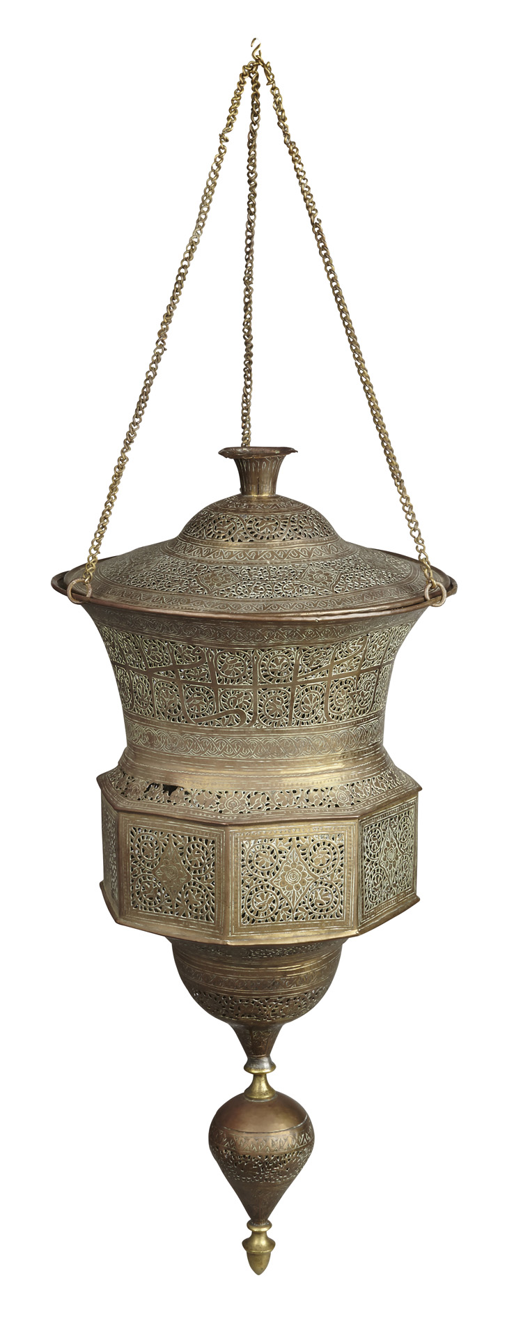 the baluster, facetted and trumpet form sides with ornate foliate pierced sides, supported by three chains and with a domed cover