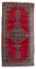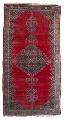 the plain scarlet red field with a large indigo medallion suspending pendants, similar sides and spandrels, within blue turtle palmette and vine border between bands