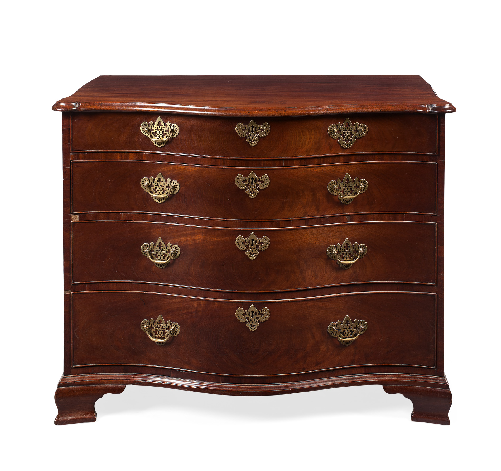 the serpentine top with a moulded edge and rounded corners above four graduated long drawers, the top drawer bearing an ivorine Frank Partridge retailer's label, raised on ogee bracket feet