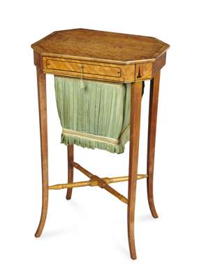 the hinged octagonal top opening to a compartmented interior above a sliding work box lined with pleated green silk, raised on square tapered legs joined by a turned X-form stretcher and ending on splayed feet