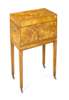 the hinged rectangular top opening to a later fitted interior with a lift out tray and baize lined compartments, raised on slender square tapered legs ending in brass castors