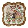 the square dish with a scalloped edge and decorated in the typical palette with a walled garden, printed and impressed marks