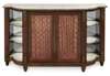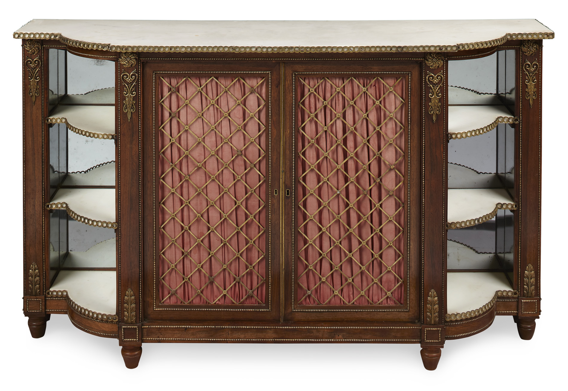 the shaped demilune white marble top over a pair of cupboard doors with brass grille inserts backed with faded red silk and opening to shelves, flanked by three mirror-backed white marble quarter round open shelves raised on turned feet, the whole outlined with gilt metal mounts
